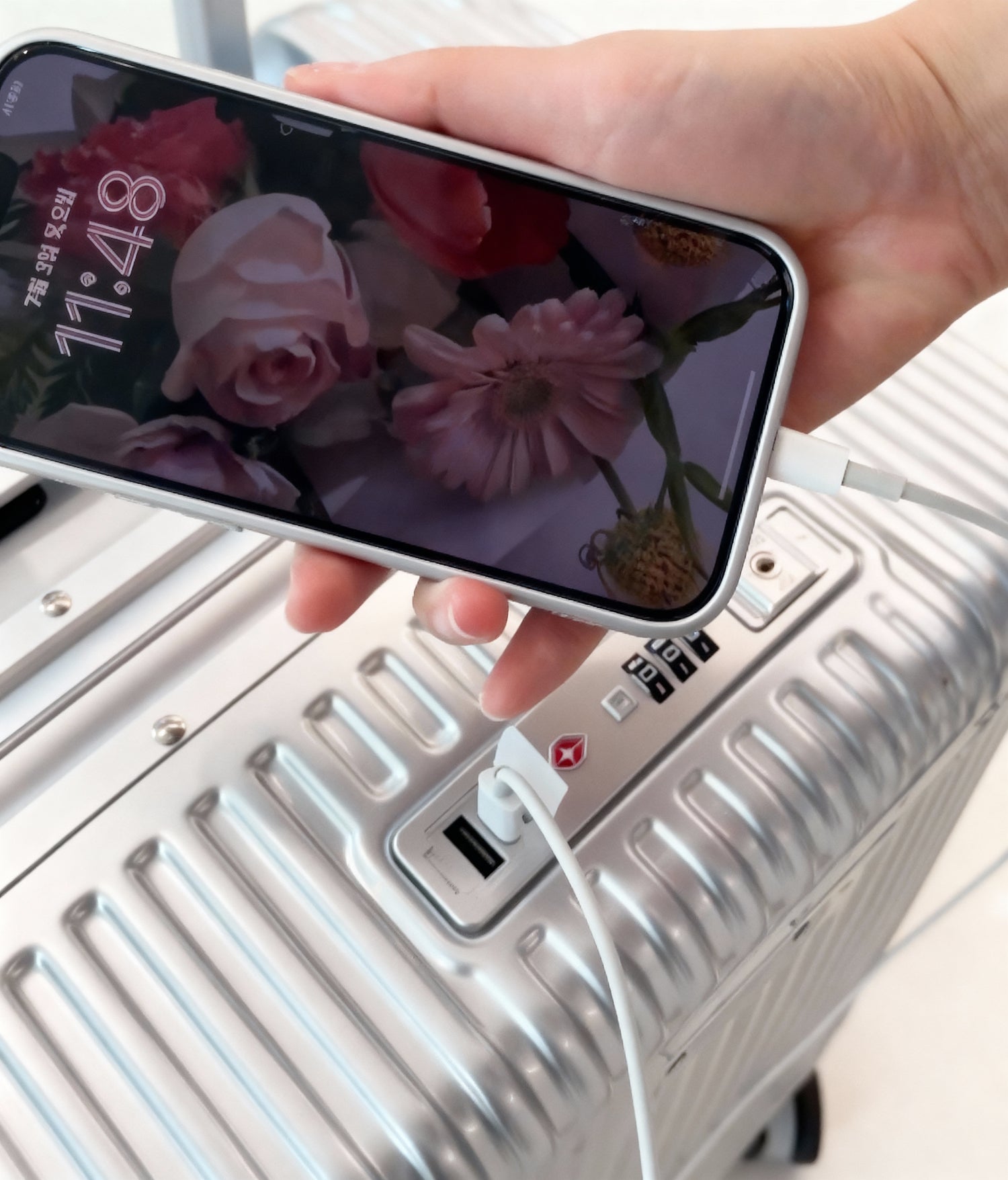 Voyagez l’esprit libre grâce à une batterie intégrée élégamment dissimulée dans votre valise. Rechargez vos appareils à tout moment, sans compromis entre style, praticité et innovation.